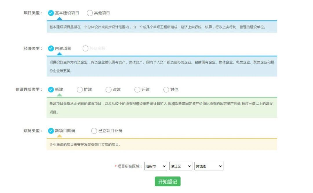 3. 按照项目情况分别确定“项目类型”“经济类型”“建设性质类型”“赋码类型”与“项目所在区域”相关信息后,点击“开始登记”。