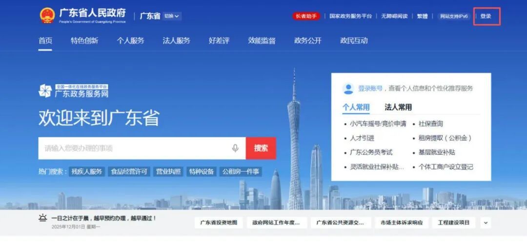 1. 通过互联网搜索打开“广东政务服务网”(http://www.gdzwfw.gov.cn/),点击右上角“登录”,选择“法人账号登录”,使用法人微信扫码登录或者账号密码等方式登录。