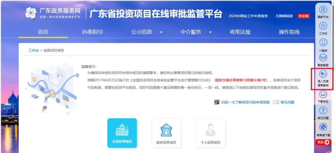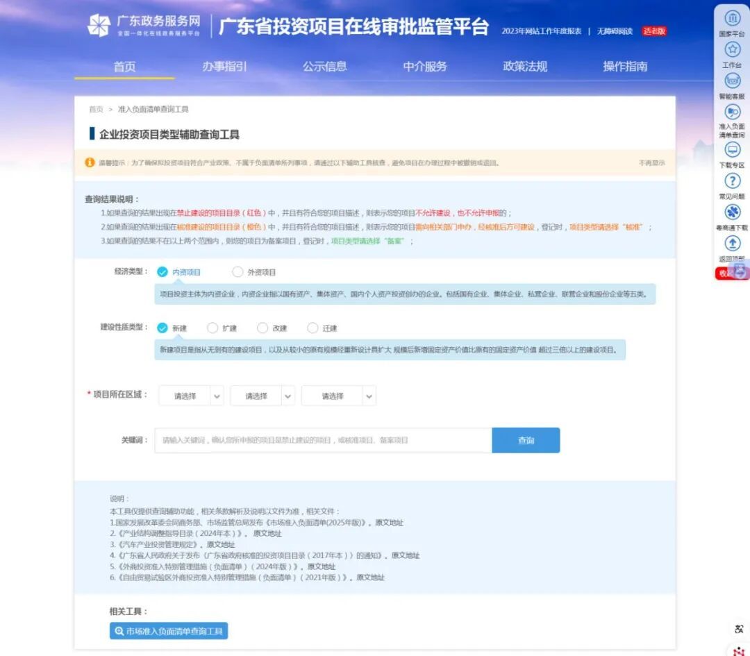 可点击右侧“准入负面清单查询”,使用“企业投资项目类型辅助查询工具”进行自查、下载相关政策文件。
