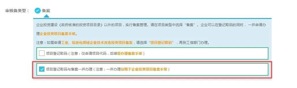 2. 在审核备案类型选择“项目登记赋码与备案一并办理”。