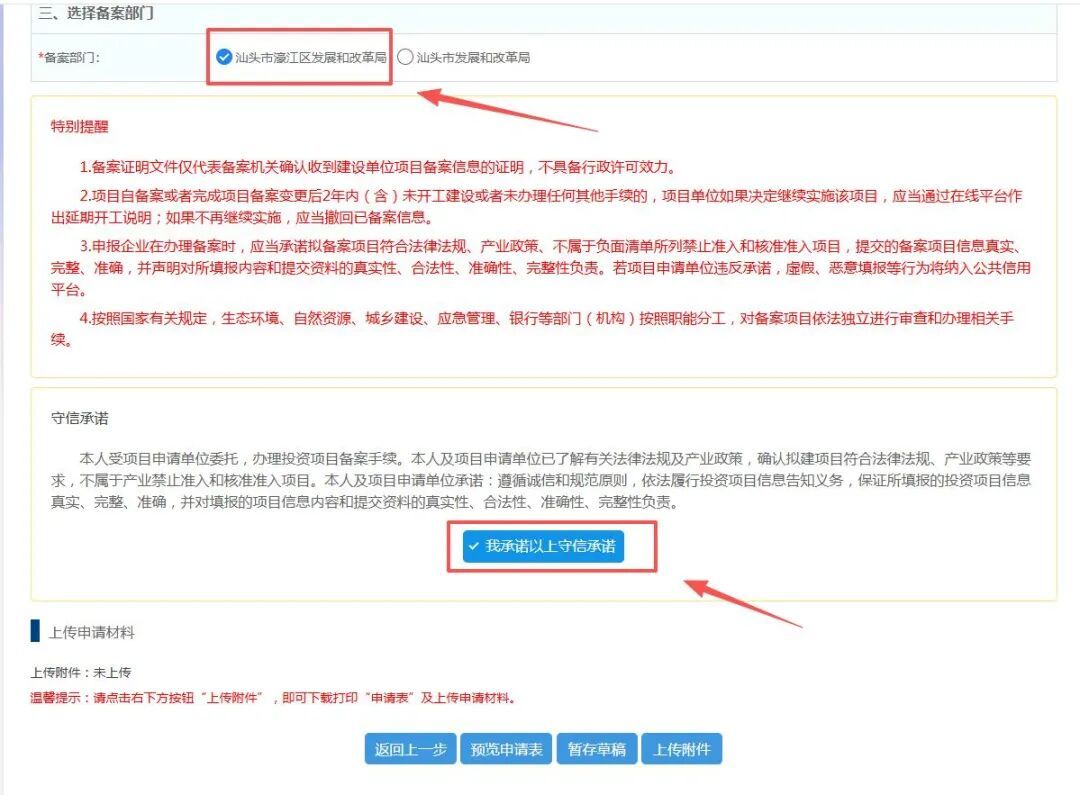 按项目所在区域选择备案部门。完成相关信息填写后,点击页面右下方按钮“上传附件”,即可下载打印“申请表”及上传申请材料。下载的“申请表”及其他申请材料需加盖单位印章后进行扫描上传,提交备案申请。