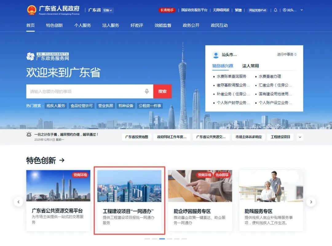 2. 在“广东政务服务网”首页“特色创新”版块,点击“工程建设项目一网通办”。